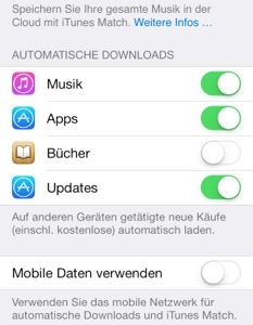 Damit nicht unterwegs ein Update erfolgt sondern nur mit einem Wi-Fi-Netz z.B. zu Hause. Dazu sollten Sie darunter befindliche Option Mobile Daten verwenden deaktivieren.